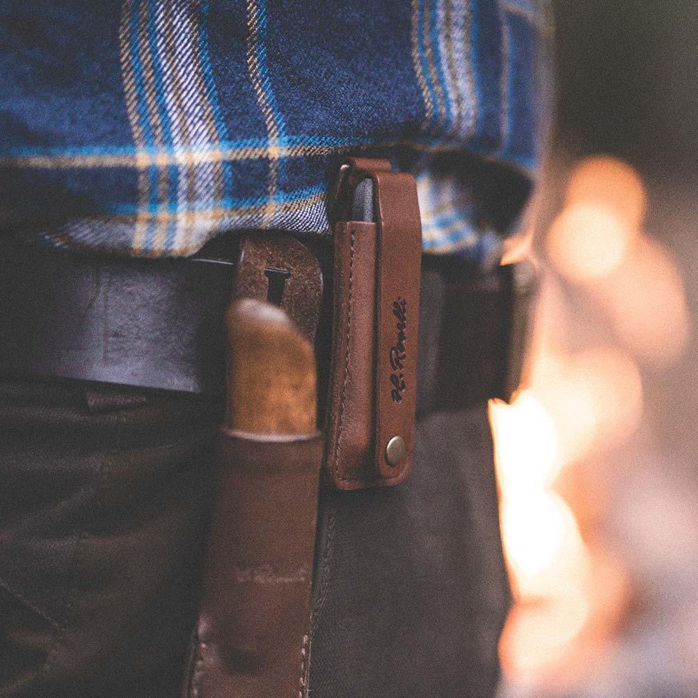 Das Lederetui hat eine praktische Lederschlinge zur Befestigung an Ihrem Rucksack, Schlüsselanhänger oder Gurt. Dies vereinfacht das Mitnehmen auf all Ihren Outdoor Abenteuern. Wird in zwei verschiedenen Modellen angeboten.